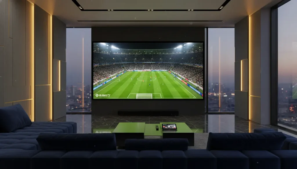 غرفة معيشة حديثة تتحول بصرياً إلى ملعب كرة قدم مع شاشة تعرض مباراة بجودة 4K عالية واستقرار كامل