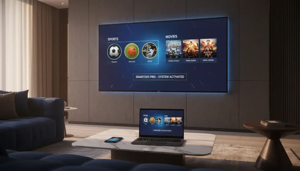 2. تطبيق IPTV Smarters Pro: المشغل الأكثر شهرة وتوافقاً مع كافة الأجهزة. يتميز بسهولة إدخال بيانات (Xtream Codes) وتنظيم القنوات في باقات مرتبة، وهو متوفر رسمياً لمعظم الشاشات الذكية.