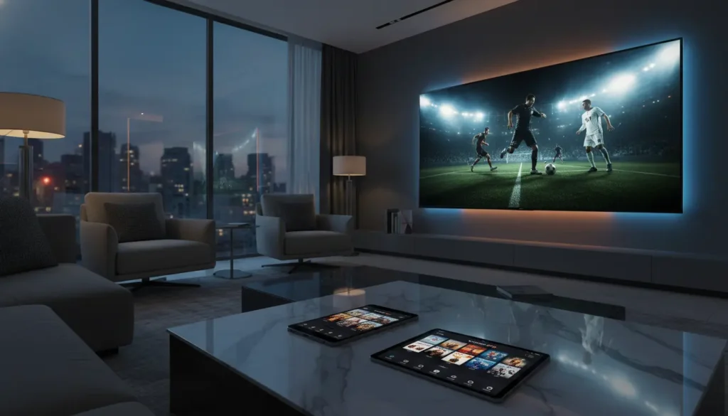 علاوة على ذلك، يمنحك استخدام اشتراك iptv للسمارت تي في بشكل مباشر ميزة سرعة الاستجابة المطلقة. ستلاحظ أن التنقل بين آلاف القنوات الحية، أو البحث داخل مكتبات الأفلام والمسلسلات الضخمة، يتم بسلاسة فائقة وبضغطة زر واحدة من جهاز التحكم الأساسي الخاص بالشاشة. إن دمج الخدمة داخل النظام الأساسي للشاشة يقلل من احتمالية حدوث تعارضات برمجية، ويضمن لك الاستفادة القصوى من تقنيات تحسين الصورة المدمجة في التلفاز مثل تقنية النطاق الديناميكي العالي، مما يضاعف من واقعية المشهد ومتعة المشاهدة.